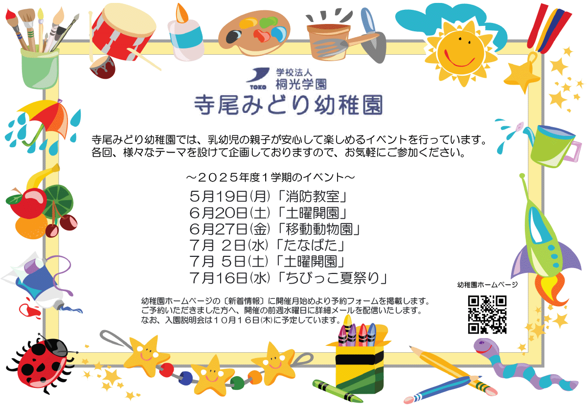 寺尾みどり幼稚園では、幼稚園らしいプログラムを通して経験を広げる場や、お友達の輪が広がる場〈おやこひろば〉を開設します。 子育て経験を持つ先生達と子ども達のかわいい姿や面白い一面を見つけながら、子どもと過ごす親子時間を楽しみませんか? 毎月のテーマは幼稚園ホームページの新着情報に掲載いたします。様々な年代の子ども達が集いますので、それぞれのペースでお気軽にご参加ください。 〈対象〉 0・1・2歳児の親子 〈費用〉 無料 〈申込〉 幼稚園ホームぺージの新着情報よりお申込みください。 開催日の数日前に最終案内メールを登録アドレス宛へ配信します。 園からの返信がない場合はお手数ですが、園へお電話でお問合せください。 幼稚園 TEL 044-955-1717